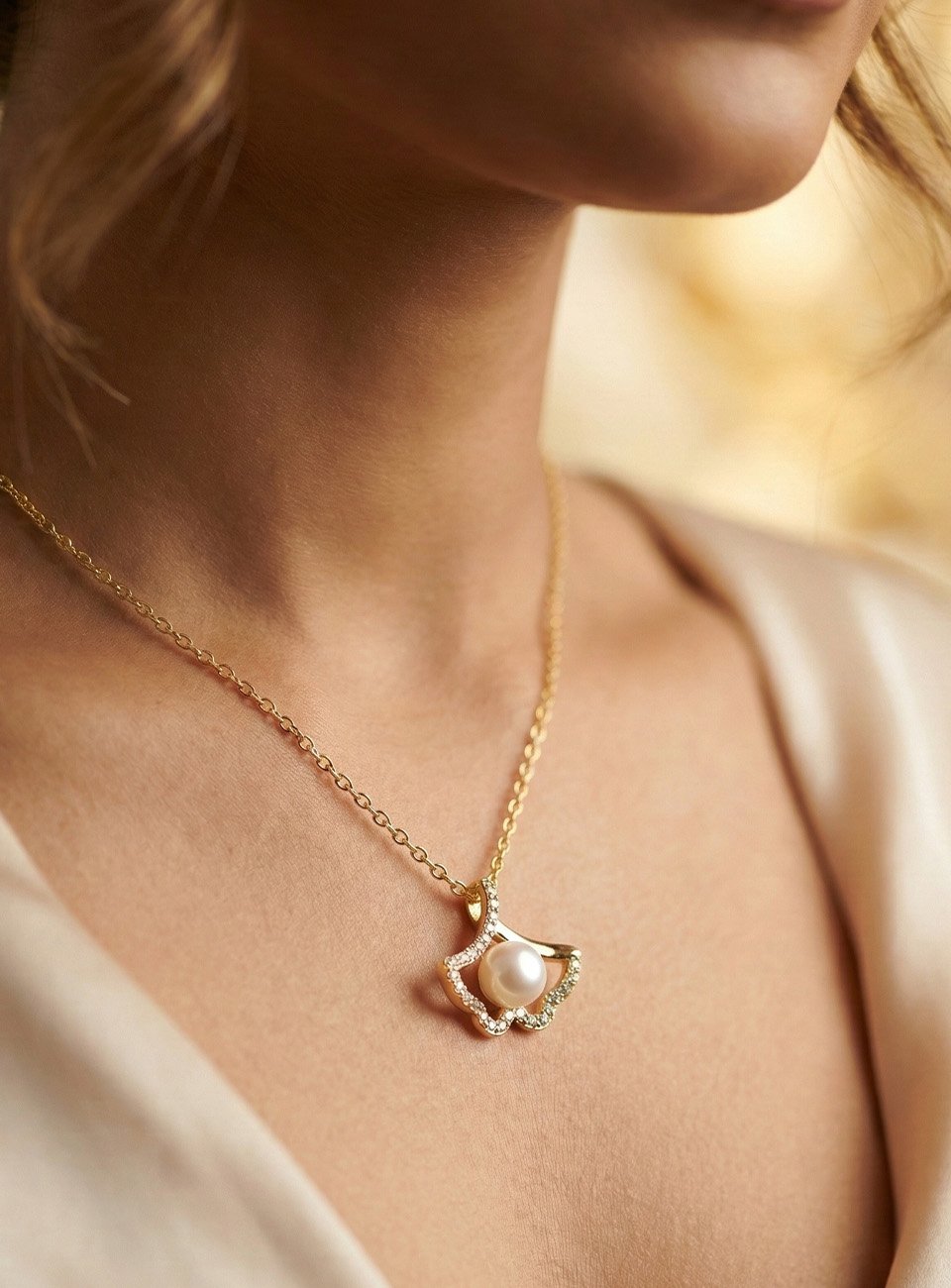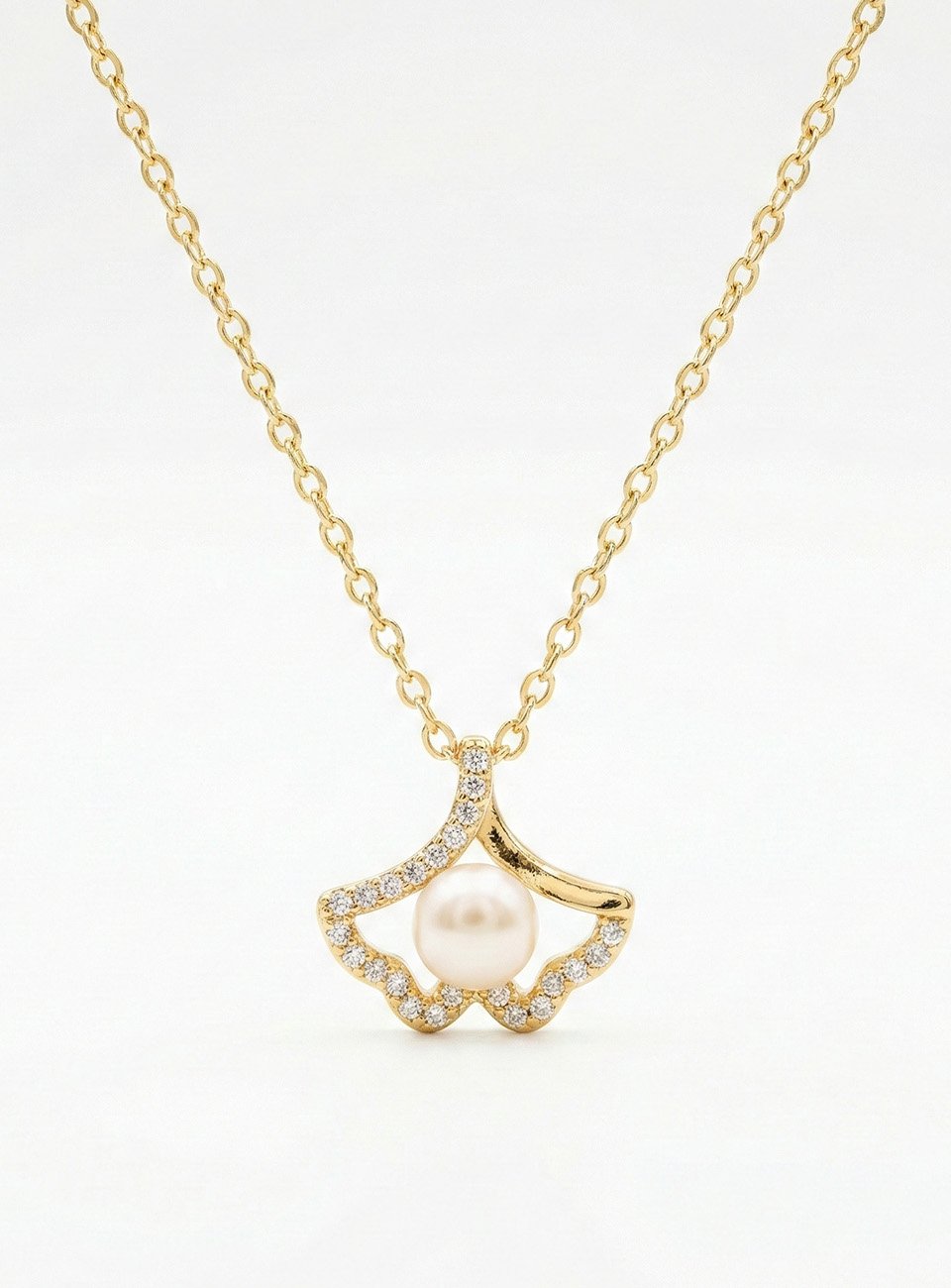 Elevate your jewelry collection with this stunning Ginkgo Leaf Pearl Necklace. Designed to symbolize longevity and resilience, the delicate ginkgo leaf pendant is crafted with a high-quality gold-tone finish and adorned with shimmering cubic zirconia crystals. At its heart sits a lustrous, white faux pearl that adds a touch of classic sophistication.