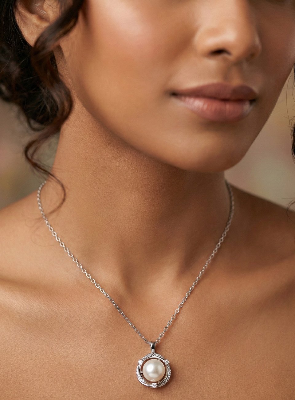 Pearl Orbit Pendant Necklace. Featuring a lustrous, high-quality white pearl cradled in a sleek silver-tone circular frame, this piece is accented with three brilliant sparkling stones for a touch of radiance. Its minimalist yet sophisticated design makes it the perfect accessory for both everyday wear and special occasions.