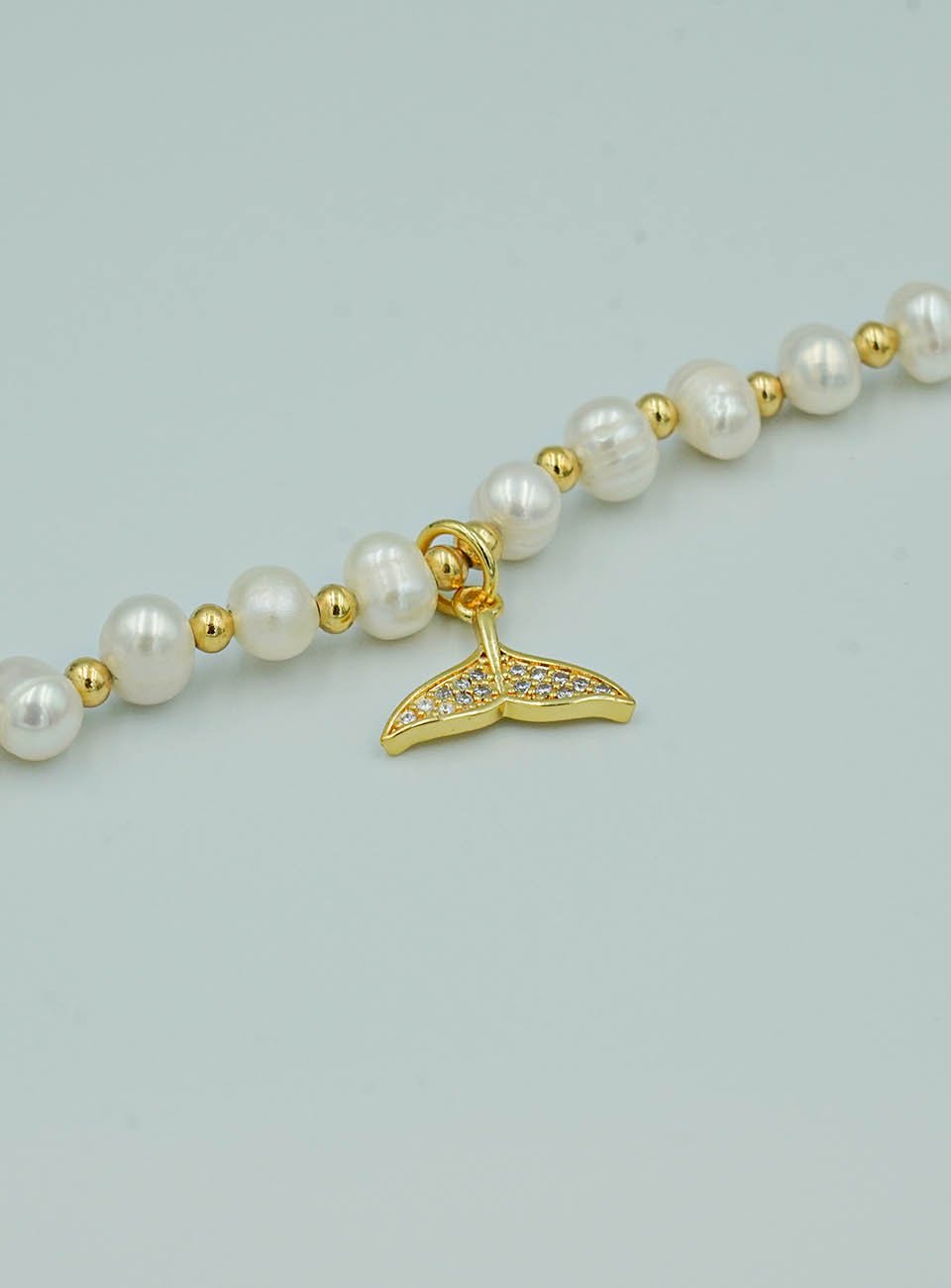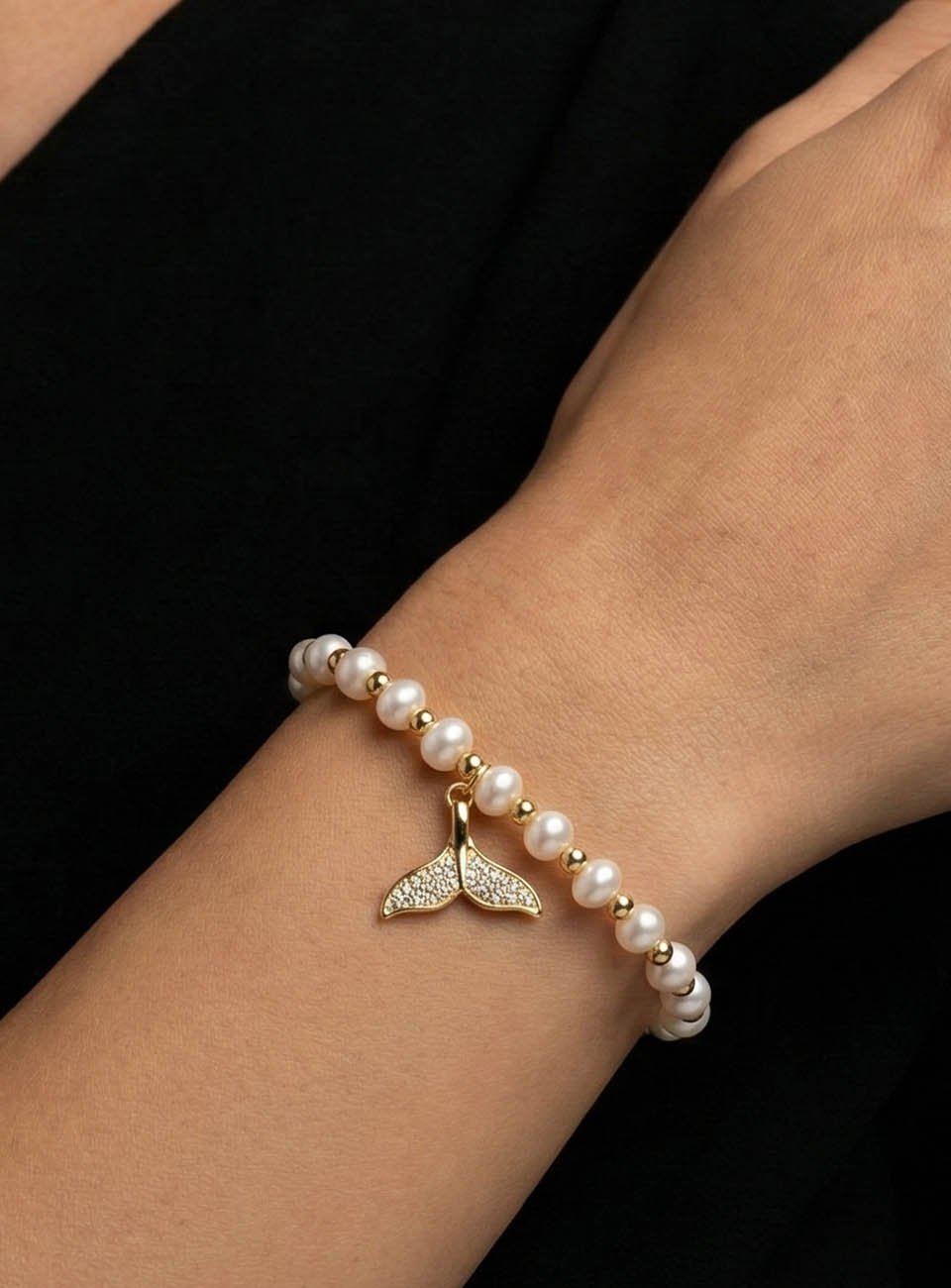 Elevate your accessory game with this delicate and aesthetic pearl bracelet. Featuring a strand of petite, high-shine white pearls accented by shimmering gold-toned beads, this bracelet is centered with a polished whale tail (mermaid tail) charm. Its minimalist yet sophisticated design makes it a perfect statement piece for ocean lovers and jewelry enthusiasts alike.