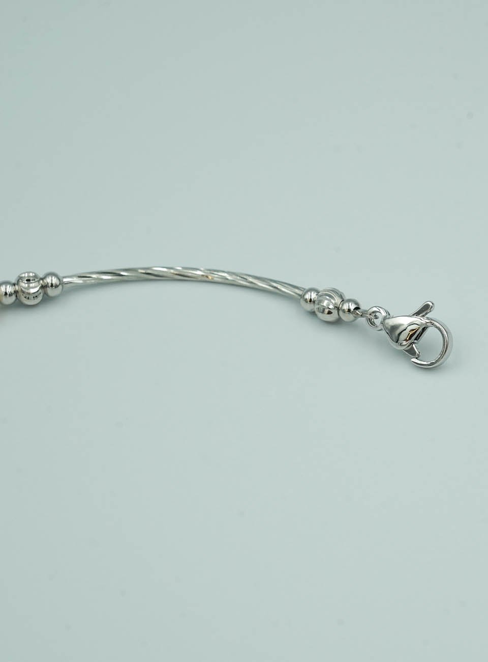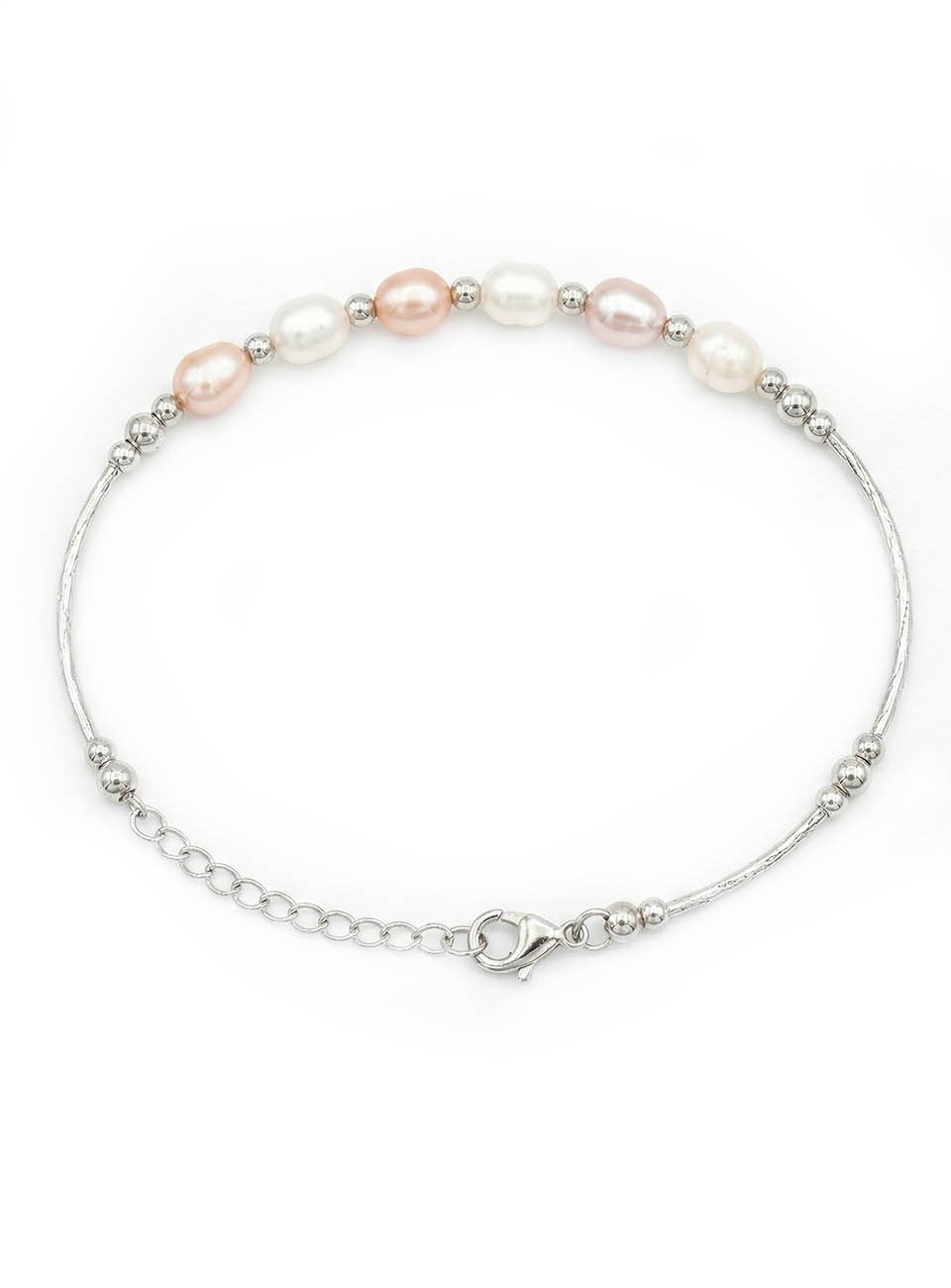 Elevate your accessory collection with this sophisticated and modern pearl bracelet. Featuring a stunning arrangement of genuine-look rice-shaped pearls, this piece showcases a soft palette of iridescent white, delicate pink, and warm peach tones. The pearls are perfectly complemented by sleek, silver-toned twisted bars and polished spacer beads, offering a contemporary twist on a timeless classic.