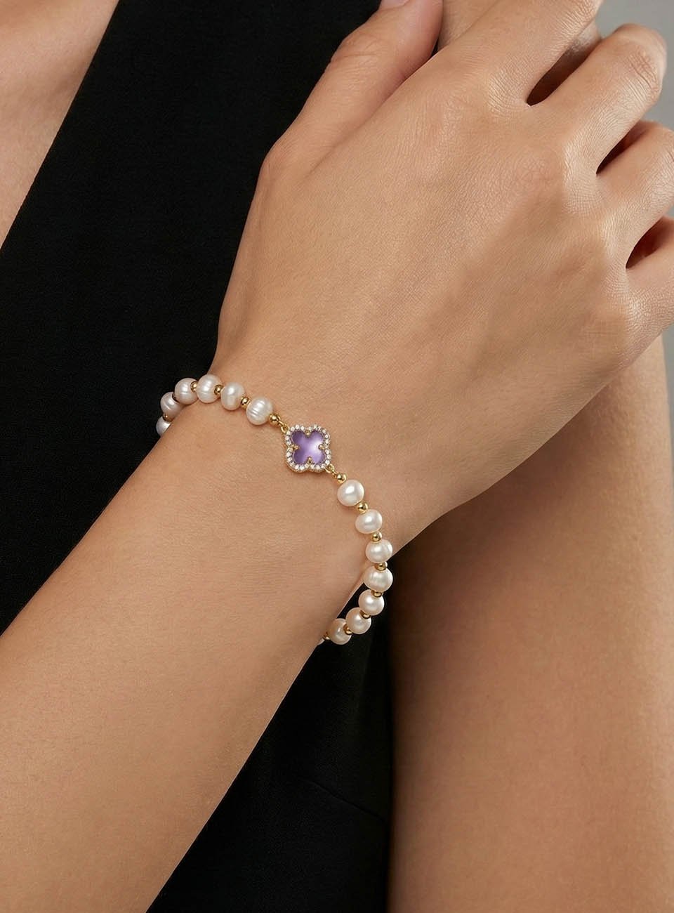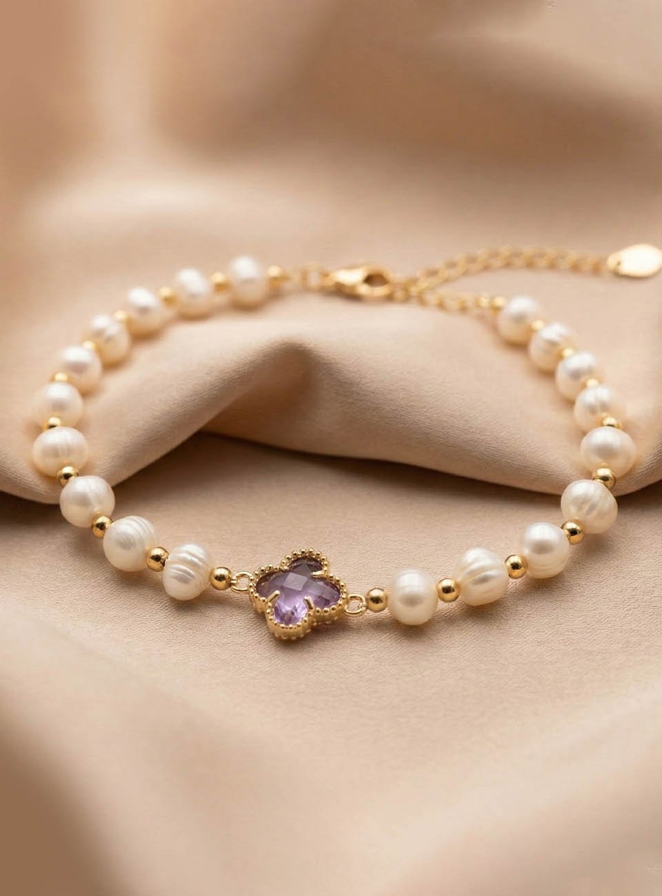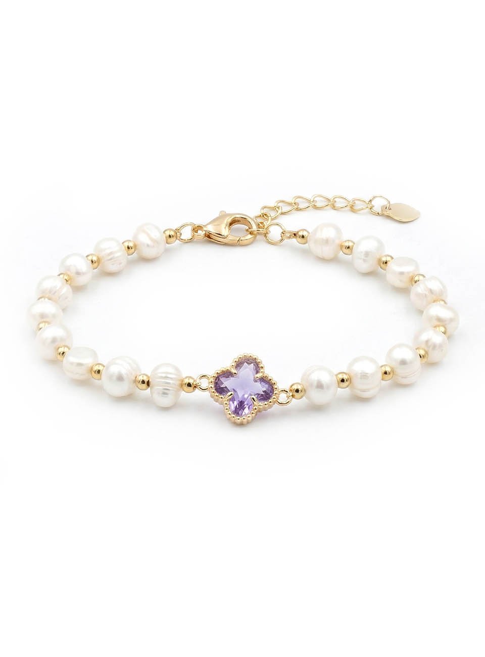 Add a touch of sophisticated luck to your jewelry collection with this stunning pearl bracelet. Featuring a string of lustrous, hand-selected freshwater pearls, this piece is centered by a delicate four-leaf clover charm in a soft lavender hue, framed by shimmering gold-toned accents.