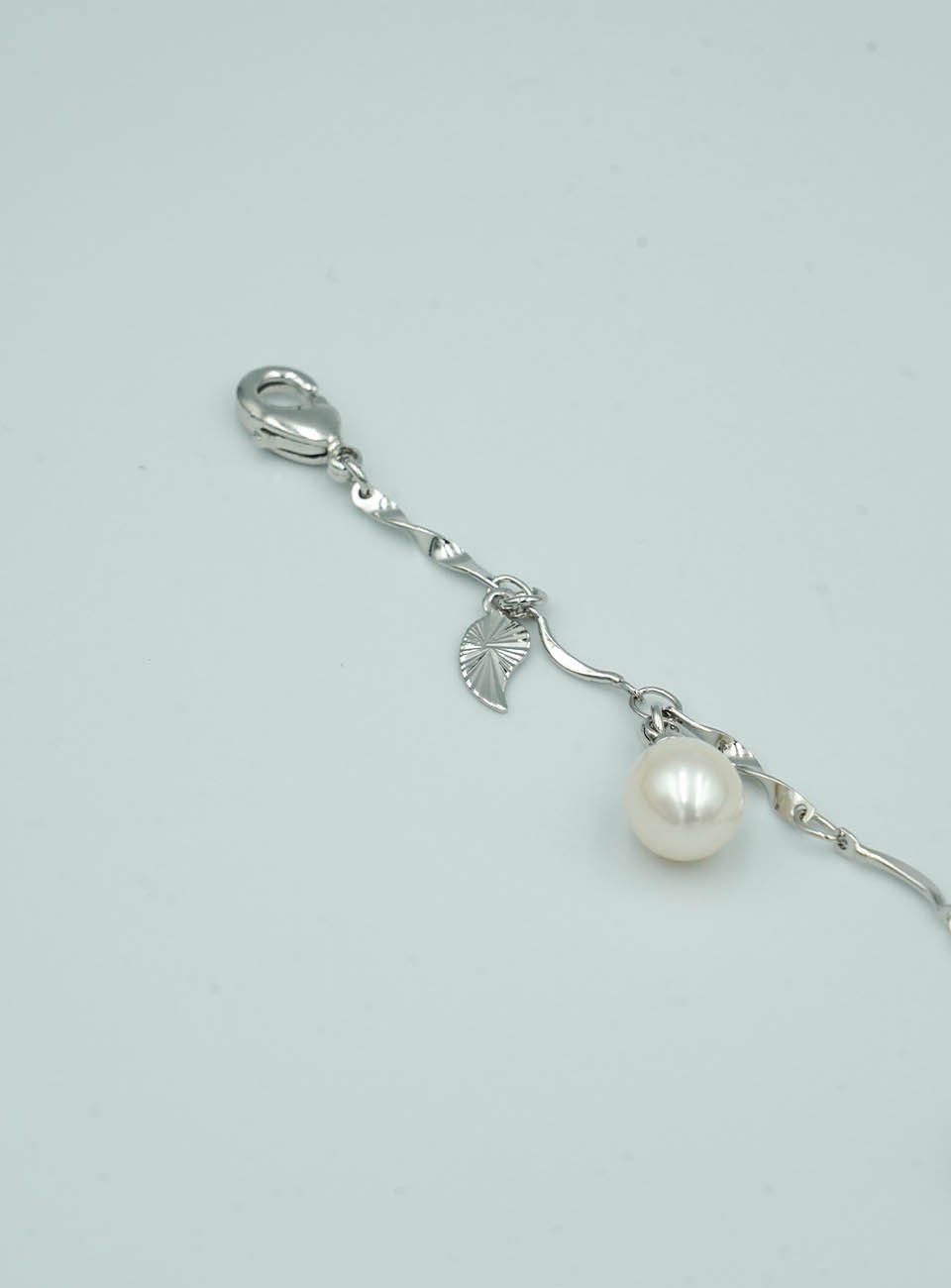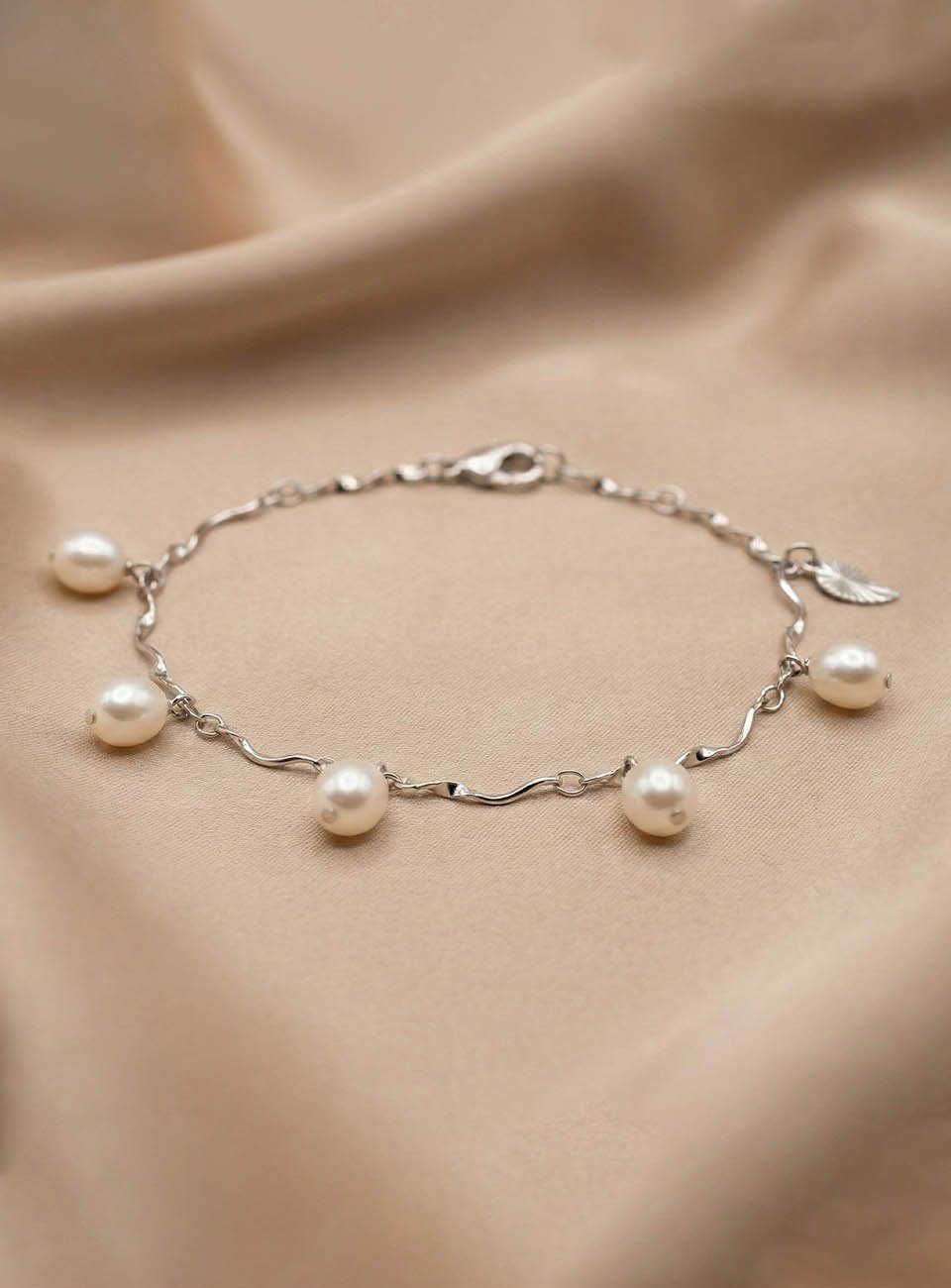 Elegant White Pearl Bracelet with Twisted Silver-Toned Chain & Leaf Charm