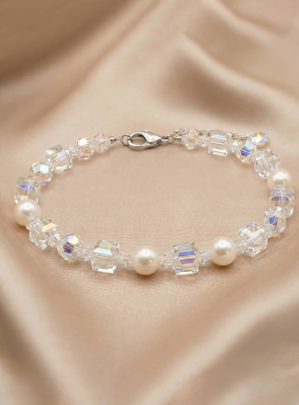 Design: Alternating classic pearls and shimmering geometric crystals for a contemporary yet timeless look.