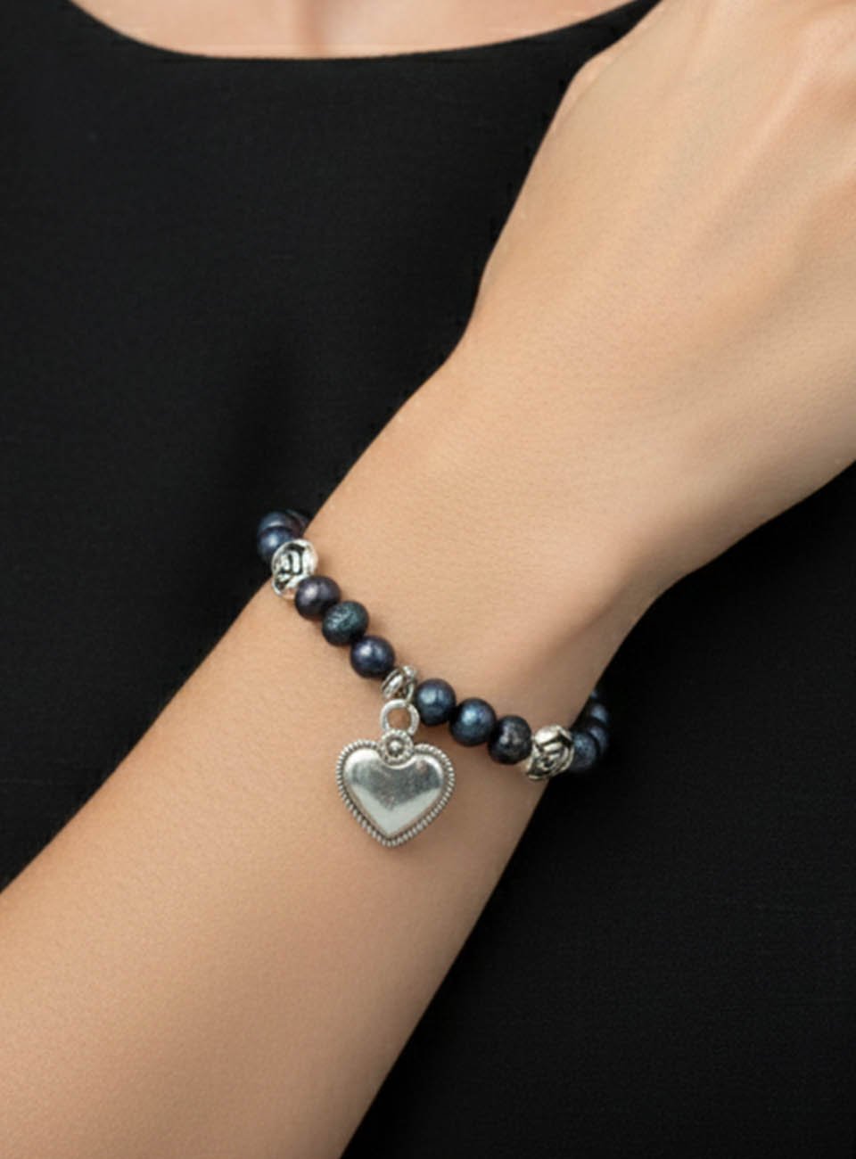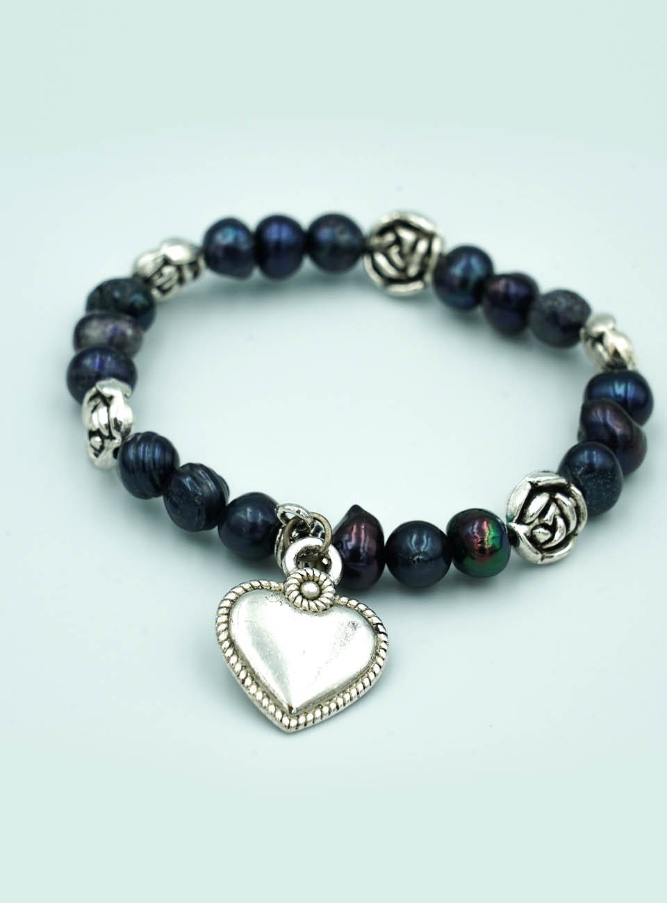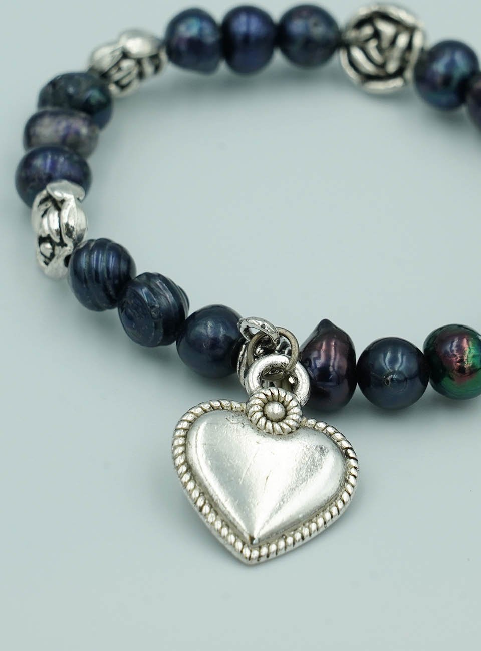Midnight Rose & Heart Cultured Pearl Charm Bracelet