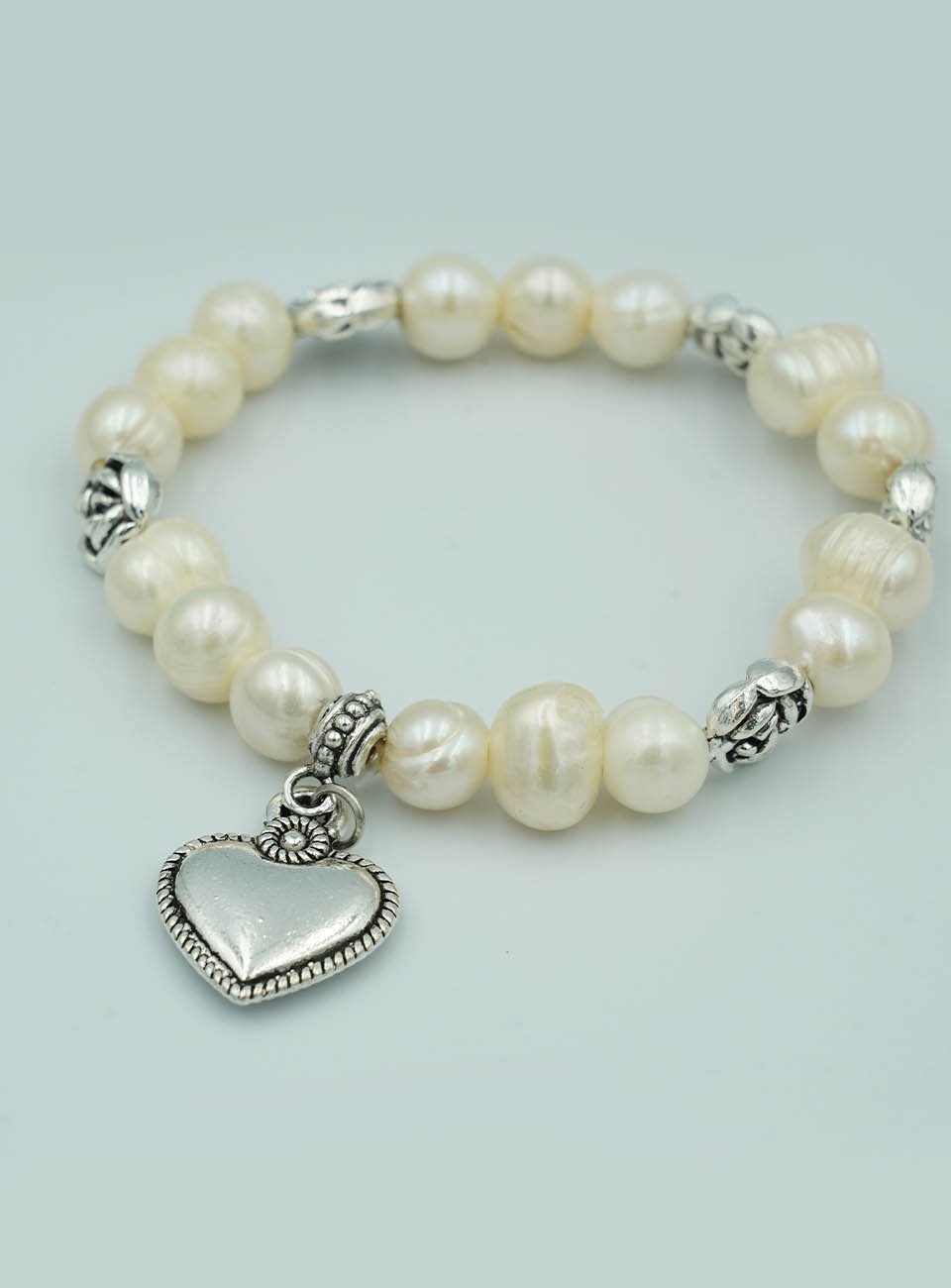 Elevate your accessory collection with this timeless Pearl Heart Charm Bracelet. Featuring a string of genuine, naturally shaped freshwater pearls, this piece offers a unique, organic luster that radiates classic elegance.