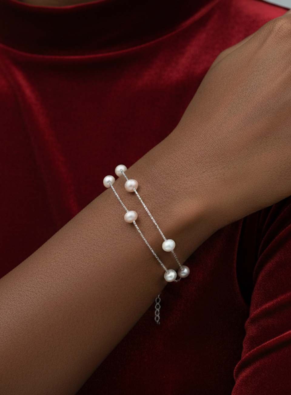 Featuring a delicate combination of shimmering white, soft pink, and champagne freshwater pearls, this piece is designed to catch the light from every angle.