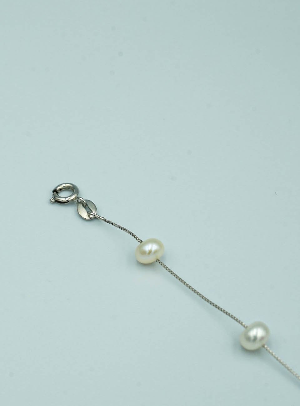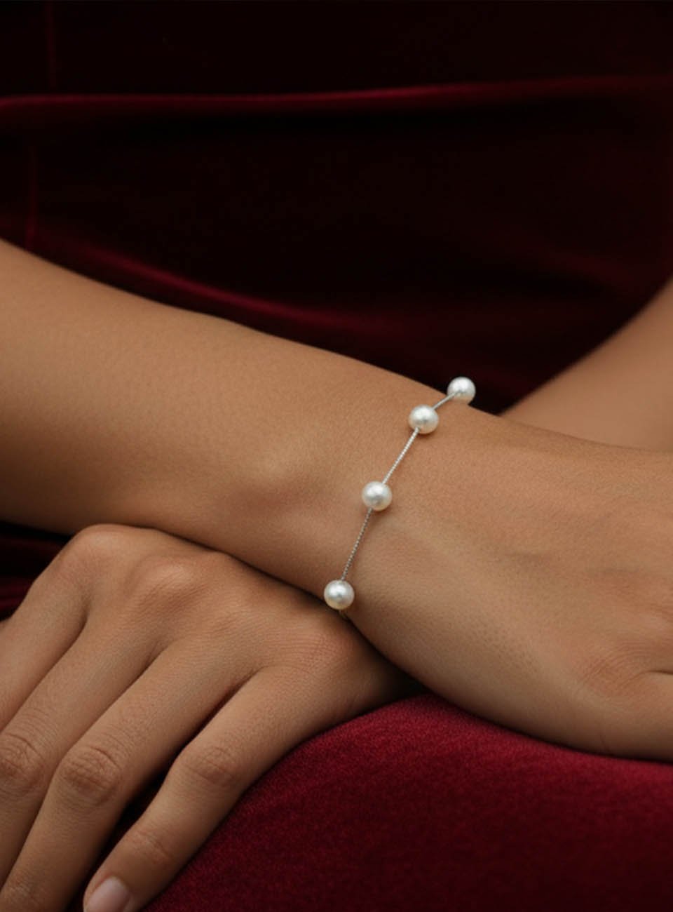Elevate your everyday style with this exquisite floating pearl station bracelet. Featuring five luminous, high-luster pearls delicately spaced along a sleek silver-toned box chain, this piece offers a perfect blend of classic elegance and contemporary design.
