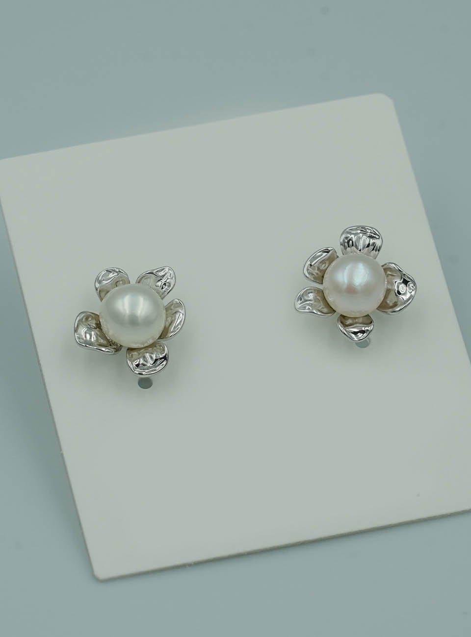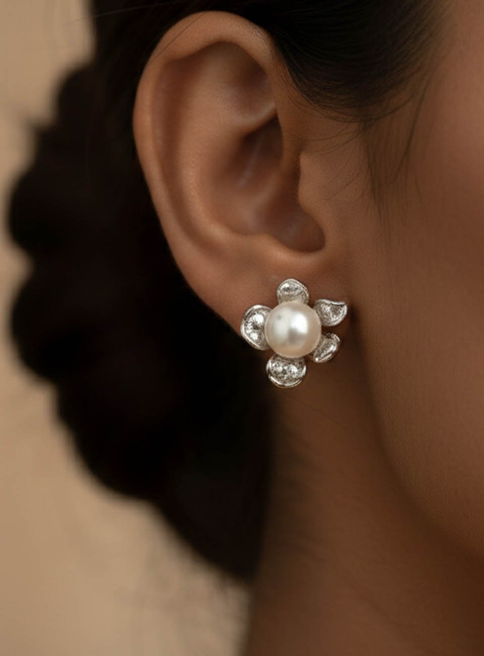 Each earring features a high-luster, creamy white pearl nestled at the center of a delicately sculpted silver-tone flower. The textured petals catch the light beautifully, making these the perfect accessory for both casual outings and formal events. Lightweight, timeless, and feminine.