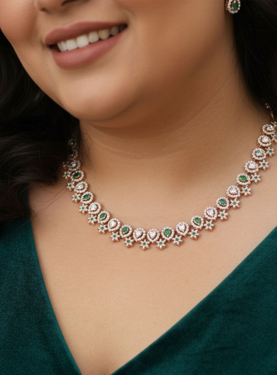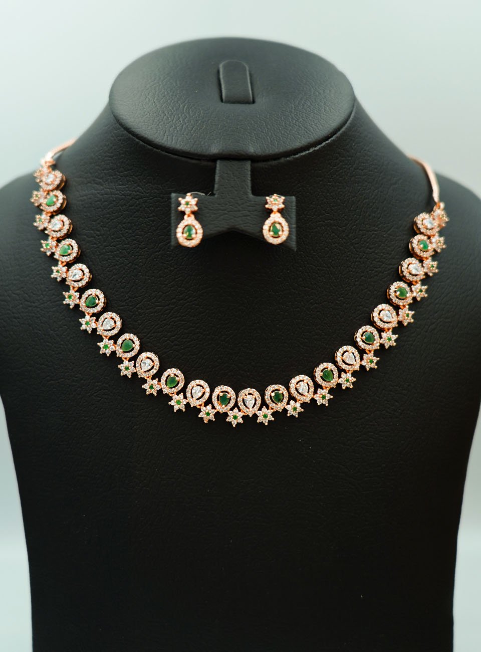 Add a touch of royal sophistication to your ensemble with this exquisite jewelry set. Featuring a beautifully crafted necklace and matching drop earrings, this set blends the warmth of rose gold with the vibrant allure of emerald-green stones.