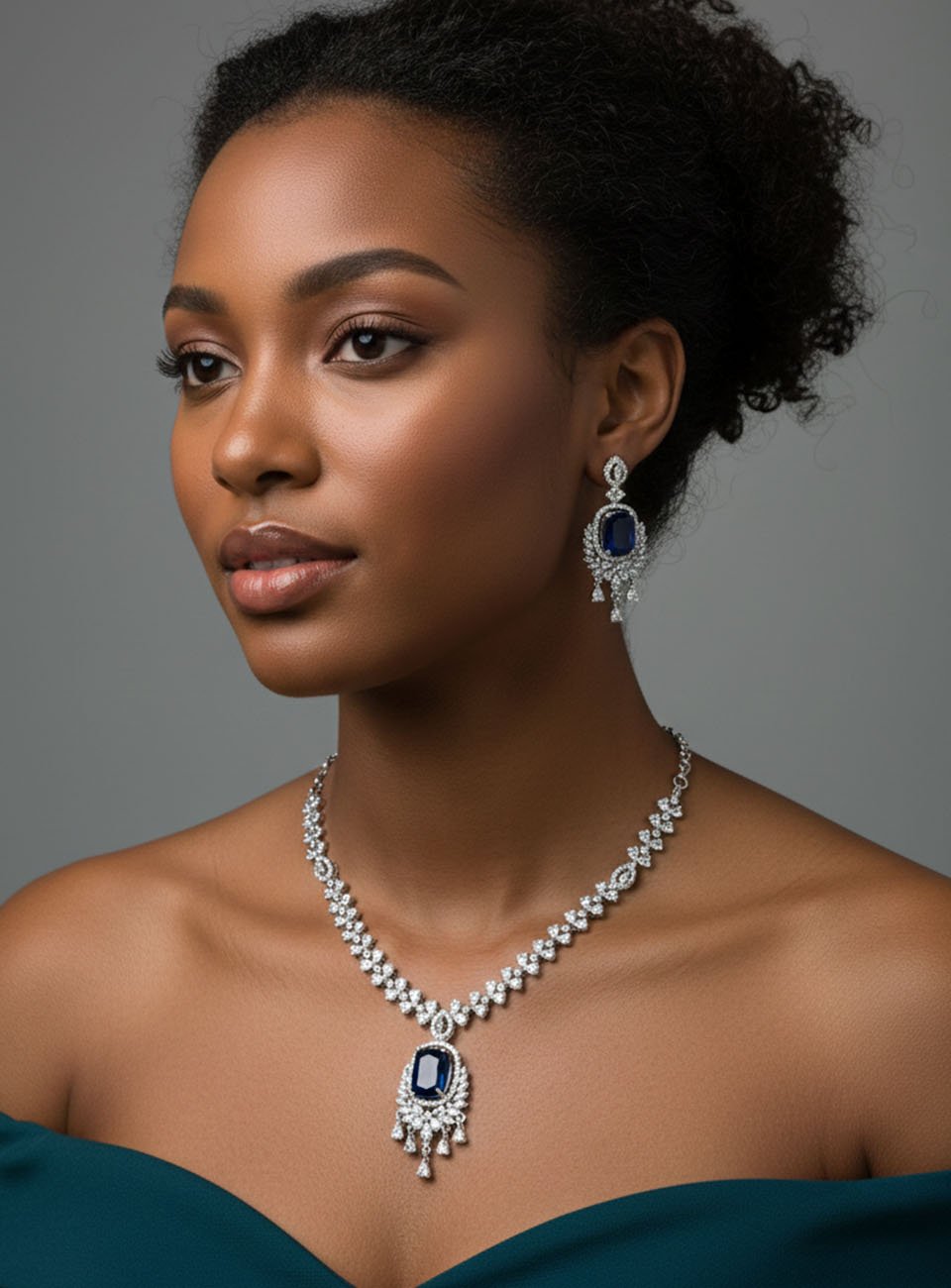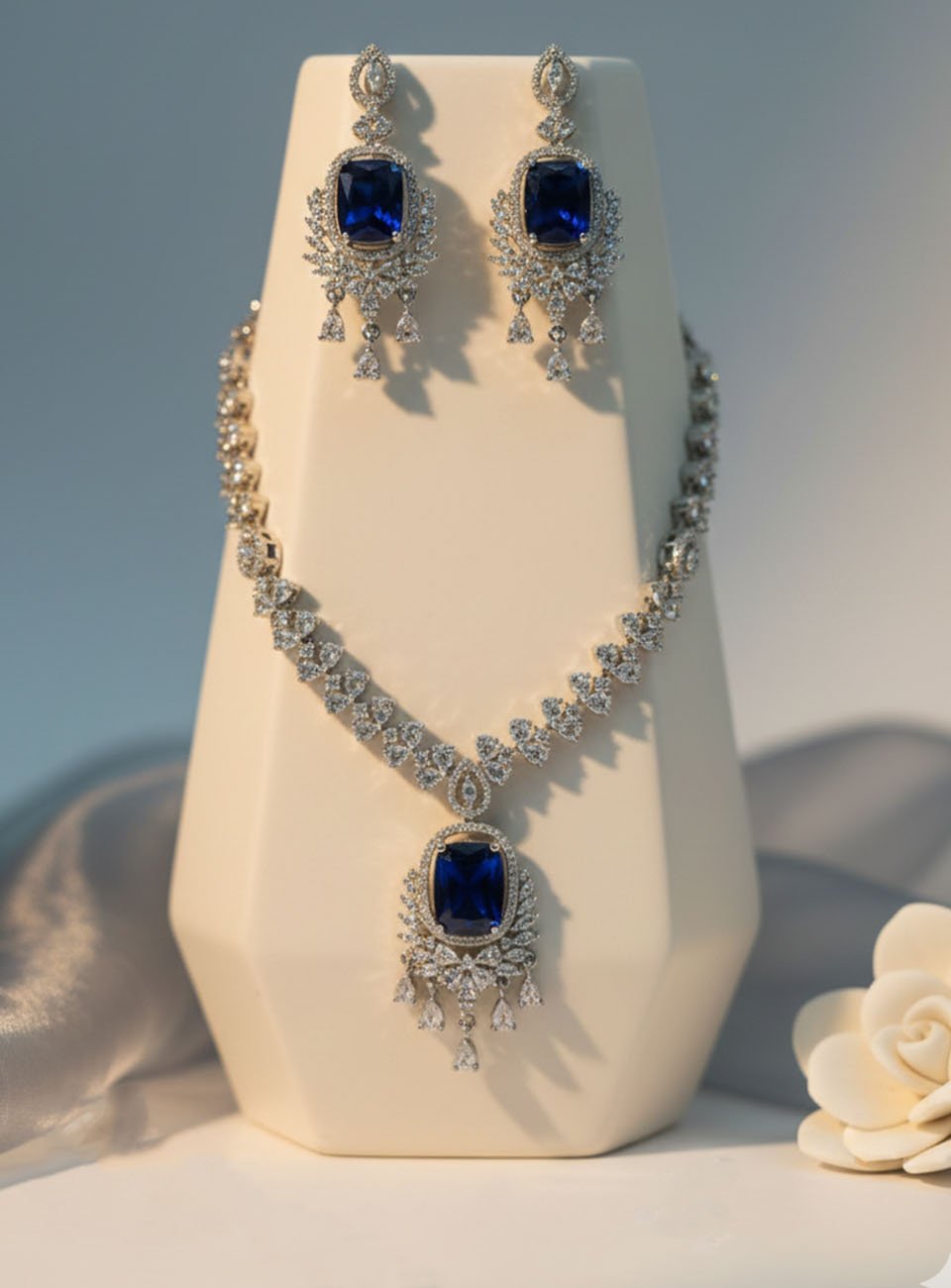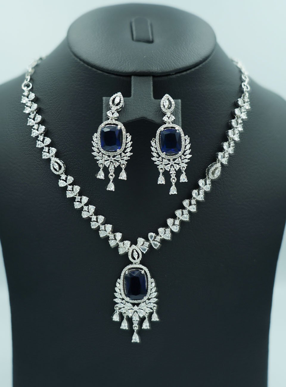 Elevate your elegance with this breathtaking jewelry set, designed for the woman who loves to make a statement. Featuring a striking cushion-cut sapphire blue center stone surrounded by a halo of shimmering marquise and pear-cut clear zircons, this set captures the light from every angle.