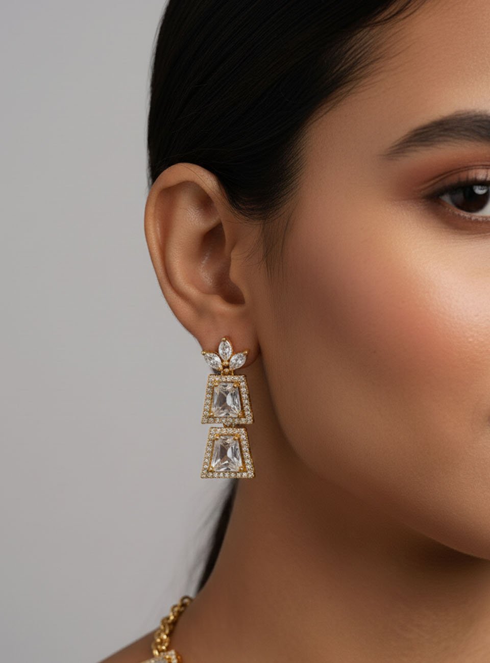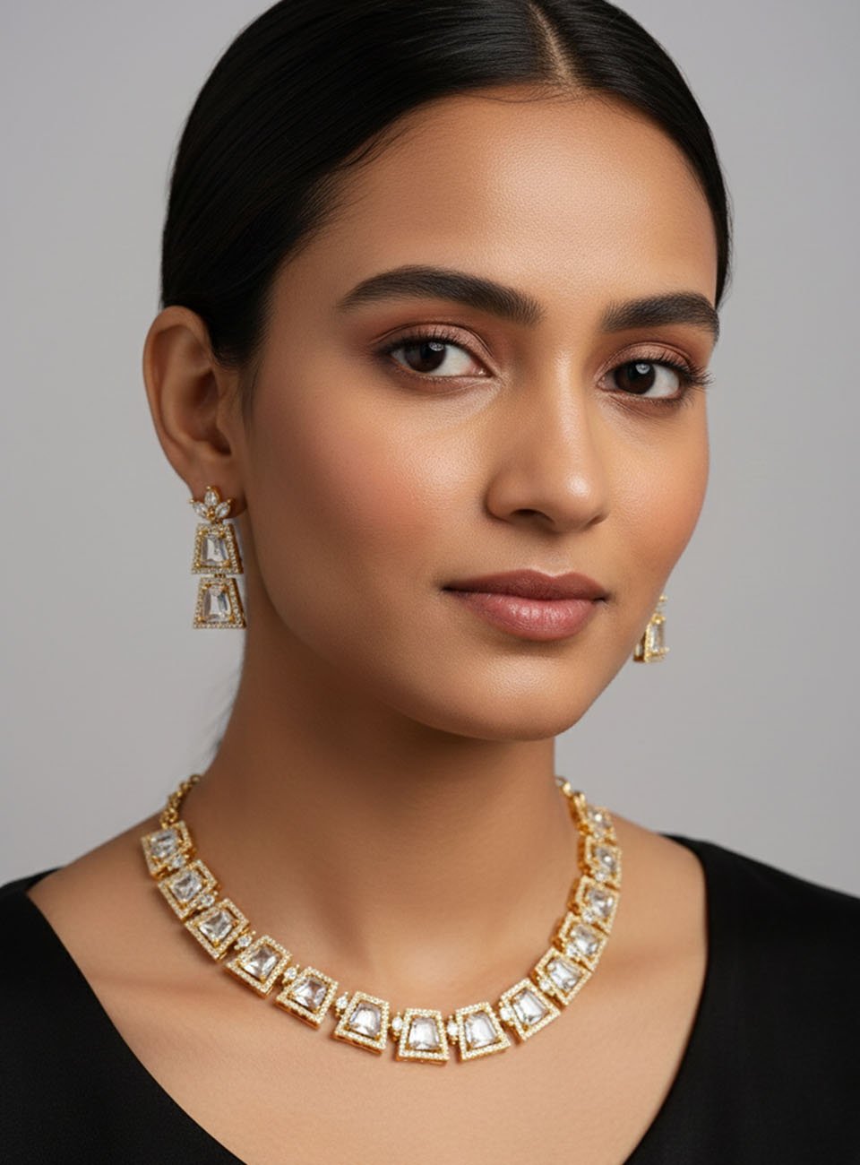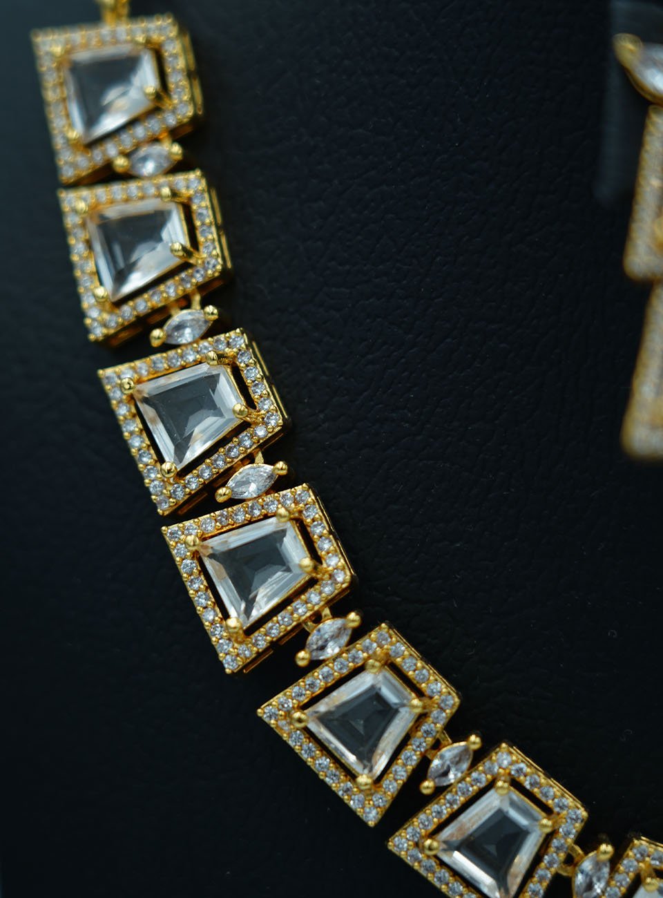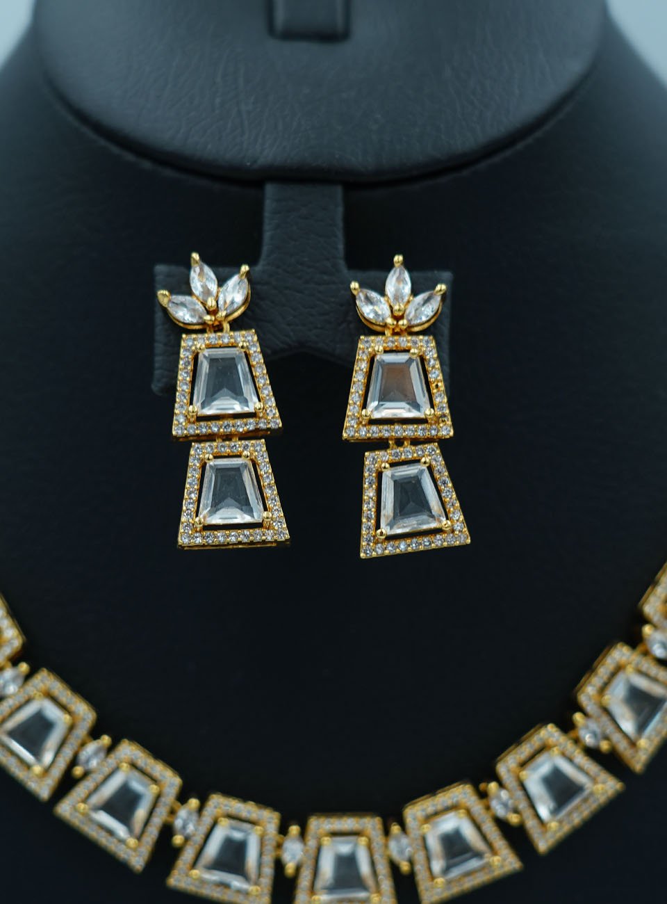 Elevate your festive wardrobe with this stunning jewelry set. Featuring a contemporary geometric design, the necklace is adorned with trapezoidal clear stones (Polki-style) encased in a refined gold-plated frame with delicate micro-shimmer accents. The set includes a matching pair of tiered drop earrings that mirror the necklace's architectural beauty.