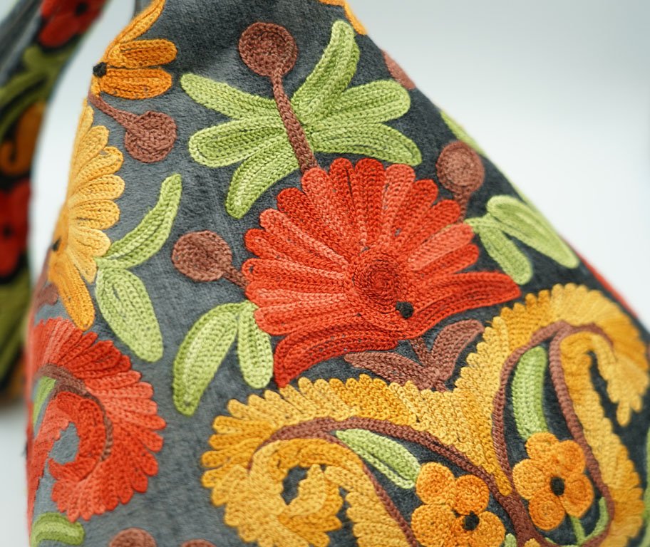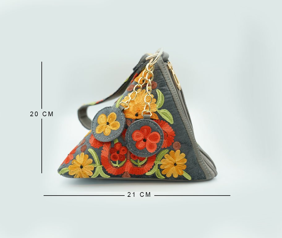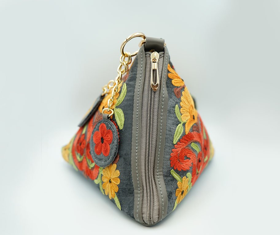 This unique triangle-shaped clutch is a perfect blend of modern geometry and traditional craftsmanship. Featuring vibrant, high-density floral embroidery on a sophisticated charcoal grey base, it is designed for those who want to make a statement.