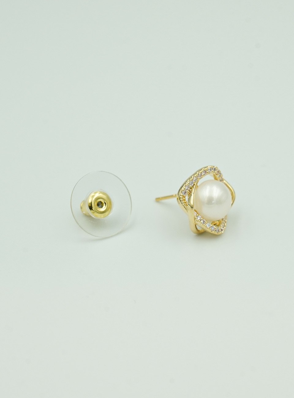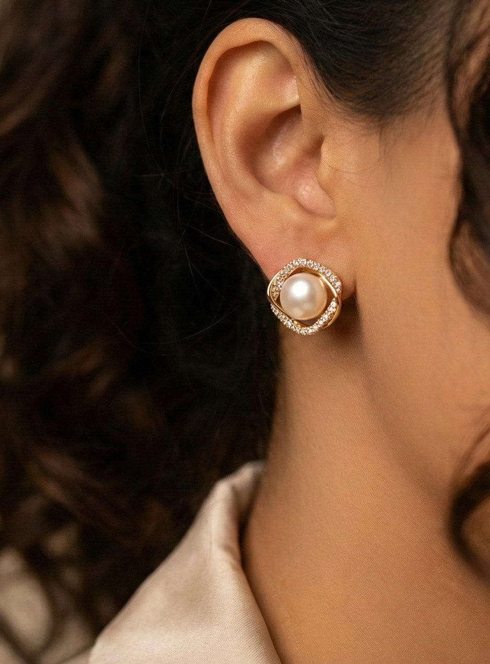 Add a touch of classic sophistication to your jewelry collection with these exquisite pearl stud earrings. Featuring a high-luster, creamy white pearl at the center, each earring is encased in a uniquely swirled, square-shaped frame. The gold-toned setting is meticulously pavé-set with shimmering crystals that catch the light from every angle.