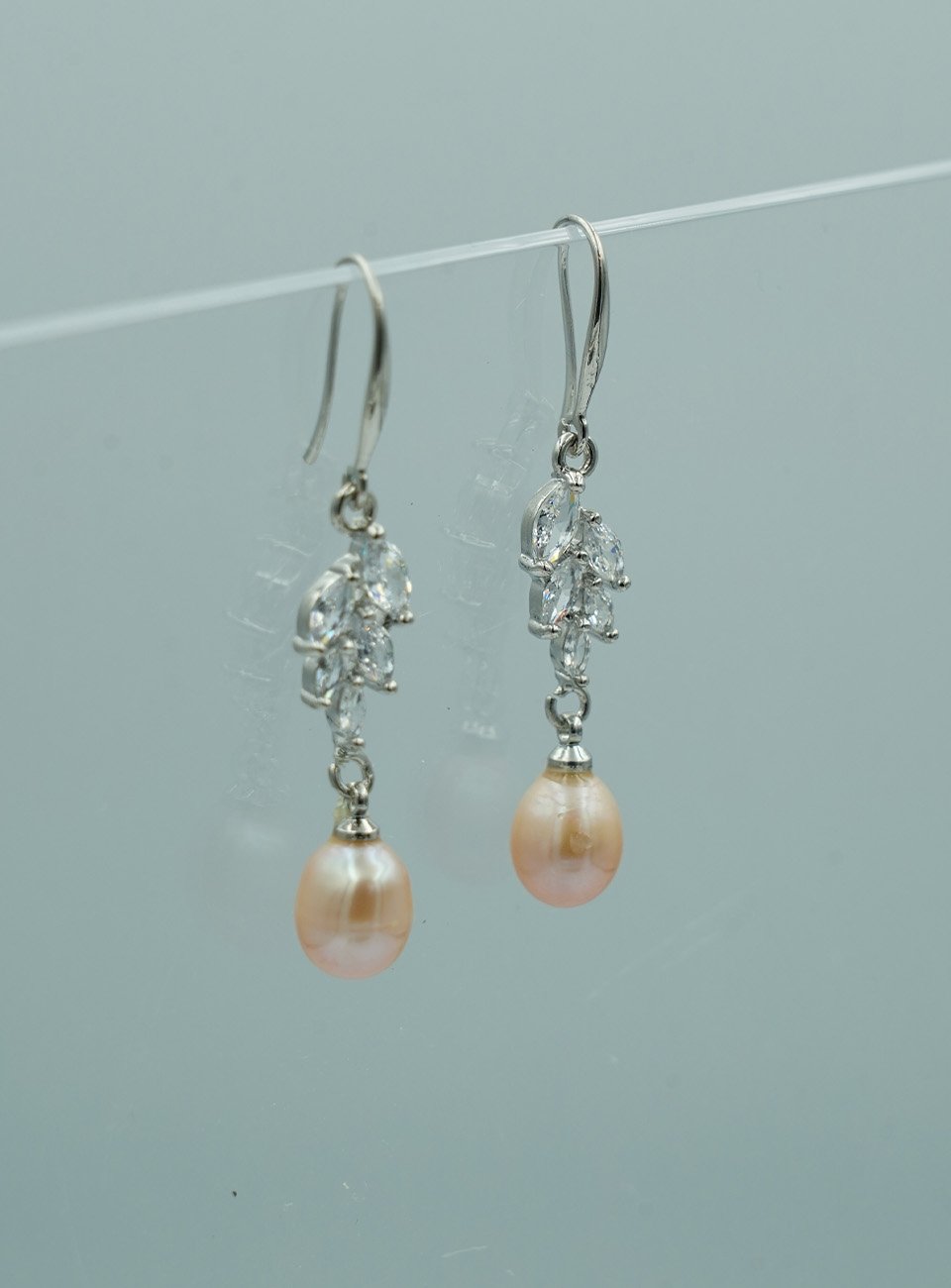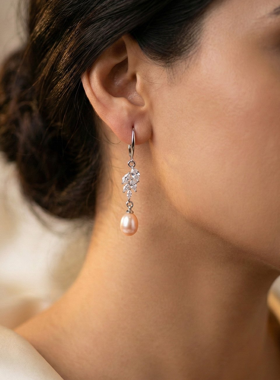 Elevate your jewelry collection with these exquisite champagne pearl drop earrings. Featuring a sophisticated leaf-inspired design, these earrings are adorned with shimmering marquise-cut crystals that catch the light beautifully. The delicate peach-toned pearls add a touch of warmth and classic luxury, making them the perfect accessory for weddings, special occasions, or as a thoughtful gift. Designed with comfortable hook closures for easy all-day wear.