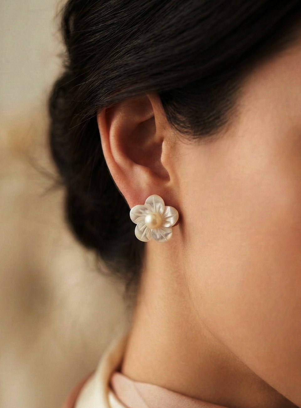 Add a touch of natural grace to your jewelry collection with these exquisite floral stud earrings. Expertly carved from iridescent mother-of-pearl, each petal features a delicate ridged texture that catches the light beautifully. Finished with a shimmering cream pearl at the center, these studs offer a timeless, feminine look perfect for daily wear or special occasions.