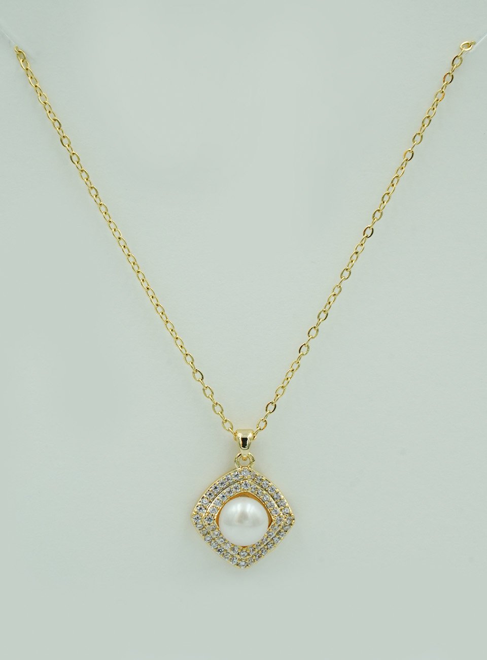 Exquisite Design: A geometric square pendant featuring a central round pearl surrounded by premium Cubic Zirconia accents.